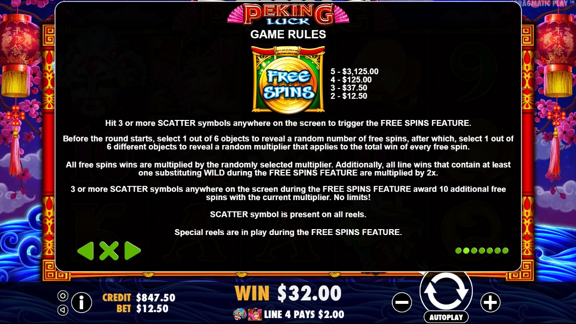 Занавес опускается, открывая мир китайской оперы в Peking Luck… Познакомьтесь с прекрасной танцовщицей-джокером, которая удваивает все выплаты. Пройдитесь за кулисы и рассмотрите костюмы, чтобы получить до тридцати восьми фри-спинов с множителями до х18.