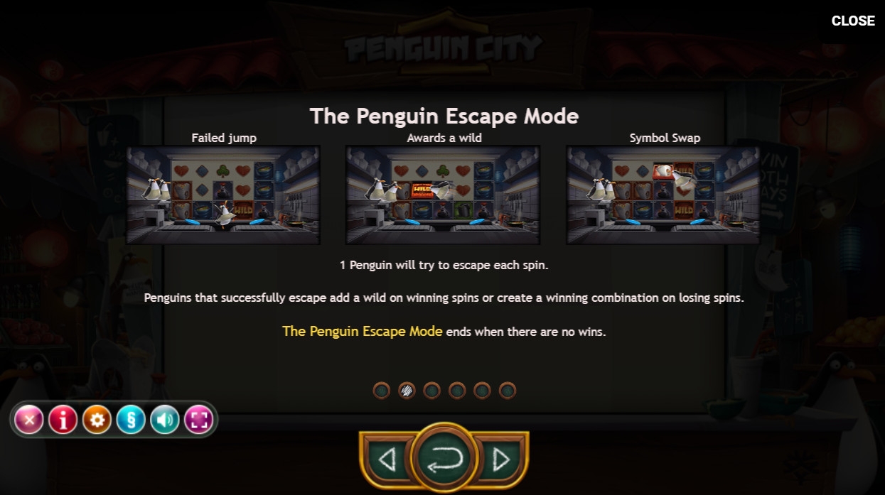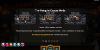 - The Penguin Escape Mode – Джокер залипает на экране. Остальные картинки сменяются в результате бесплатного респина. По его завершении один пингвин пытается сбежать, прыгая на трамплин. Если попытка удачная, он приземляется на экран, превращая одну из картинок в джокер. Этот Wild тоже становится «липким», а респины продолжаются. Раунд завершается, когда очередное вращение не приносит выплаты.