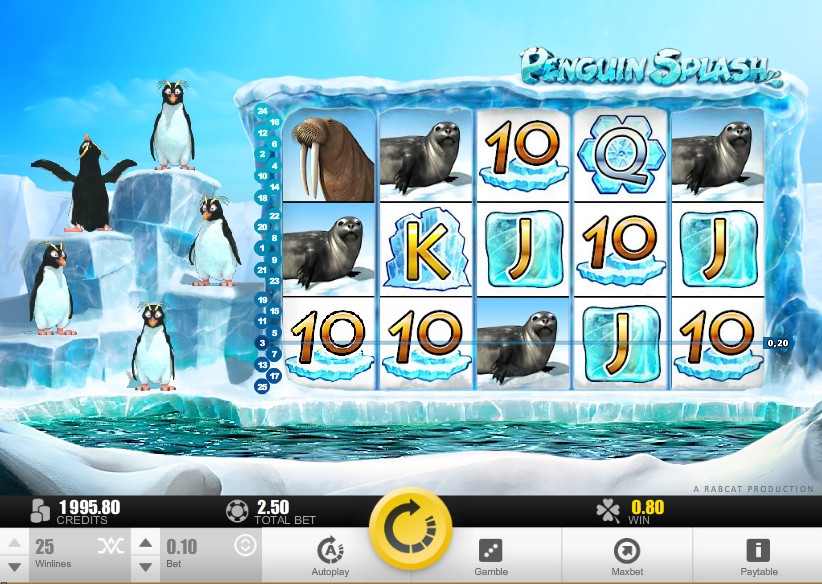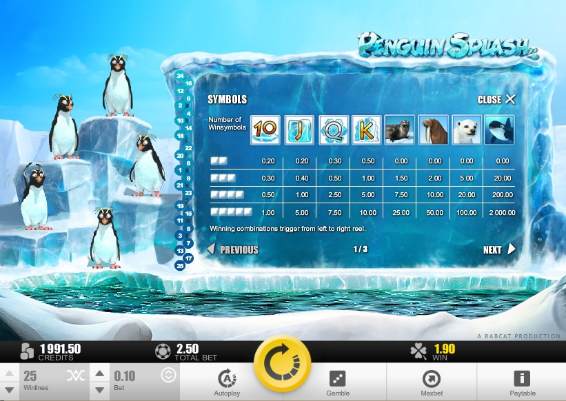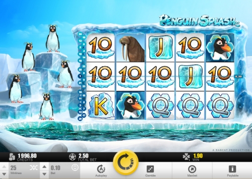 Penguin Splash – 5-барабанный видео-слот с двадцатью пятью активными линиями. Их количество клиент может установить по своему желанию. Ставка на каждую позицию варьируется в диапазоне от одного цента до двух евро. Таким образом, играть на игровом автомате можно, поставив на спин до пятидесяти евро.