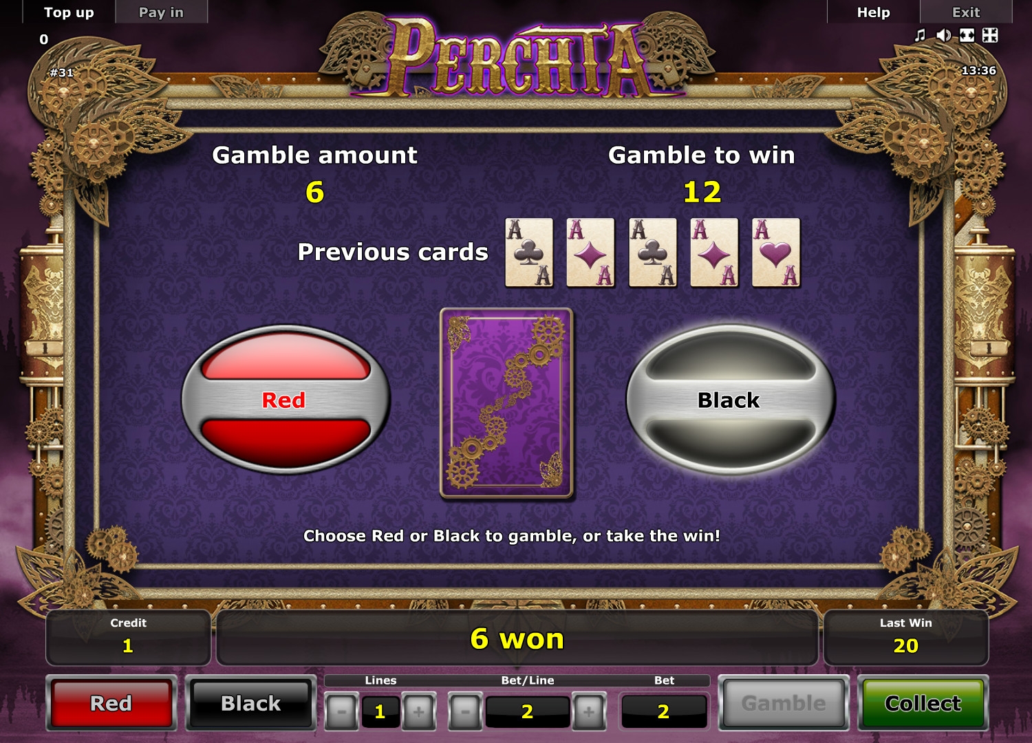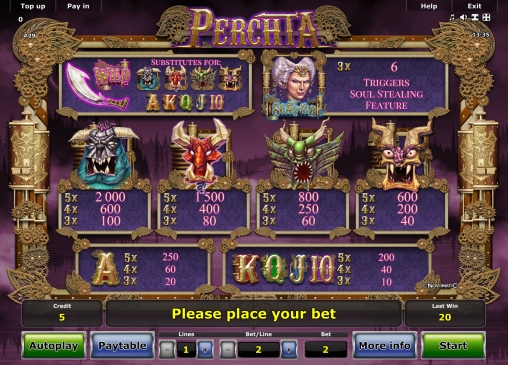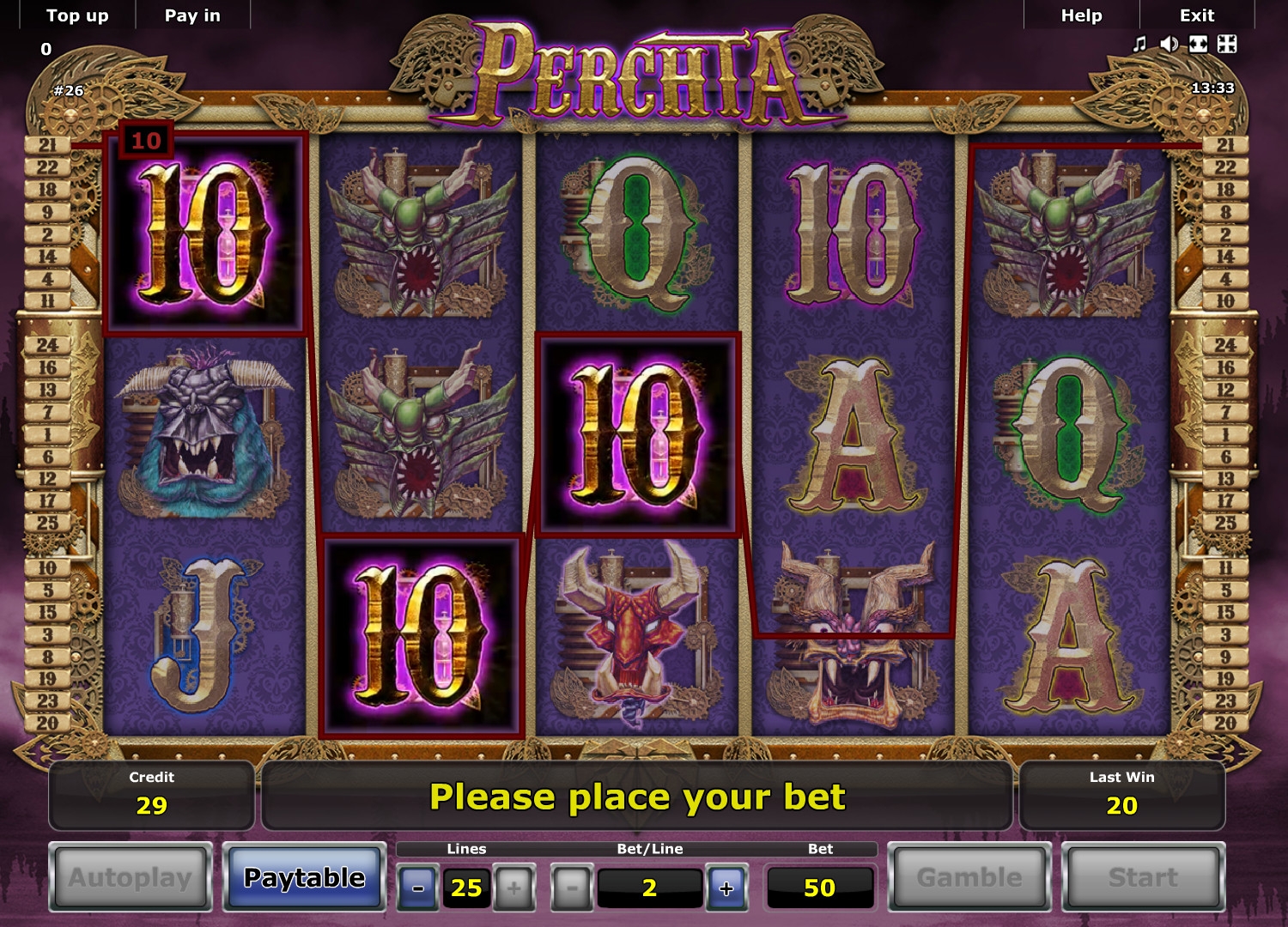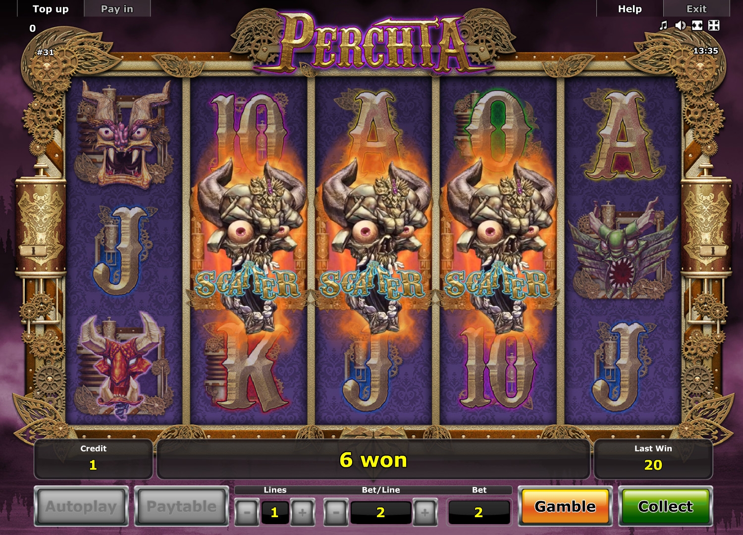 В слоте «Перхта» пять барабанов и двадцать пять линий, из которых игрок может задействовать любое количество. Ставки по ним равны: от двух до четырехсот кредитов на каждую. На спин разрешается ставить не более десяти тысяч кредитов.