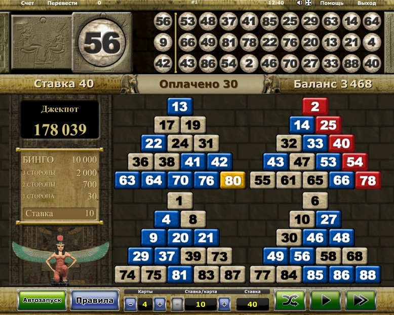На экране бинго вы увидите четыре билета в виде пирамидок. Над ними располагаются каменные шары с номерами. Слева от билетов можно увидеть таблицу выплат, в которой выигрыши указываются с учетом сделанной ставки, и окошко с суммой джек-пота.