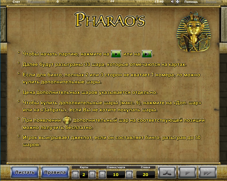 В Pharao’s Bingo есть разделы с кратким и подробным описанием правил. Настойки позволяют отключить звуковое сопровождение и растянуть окно на весь экран.