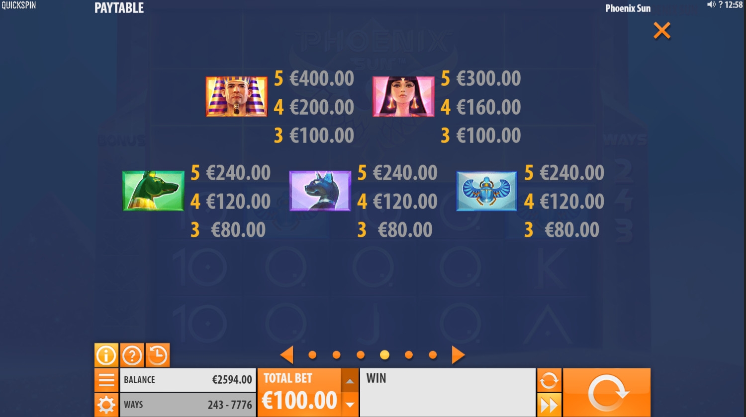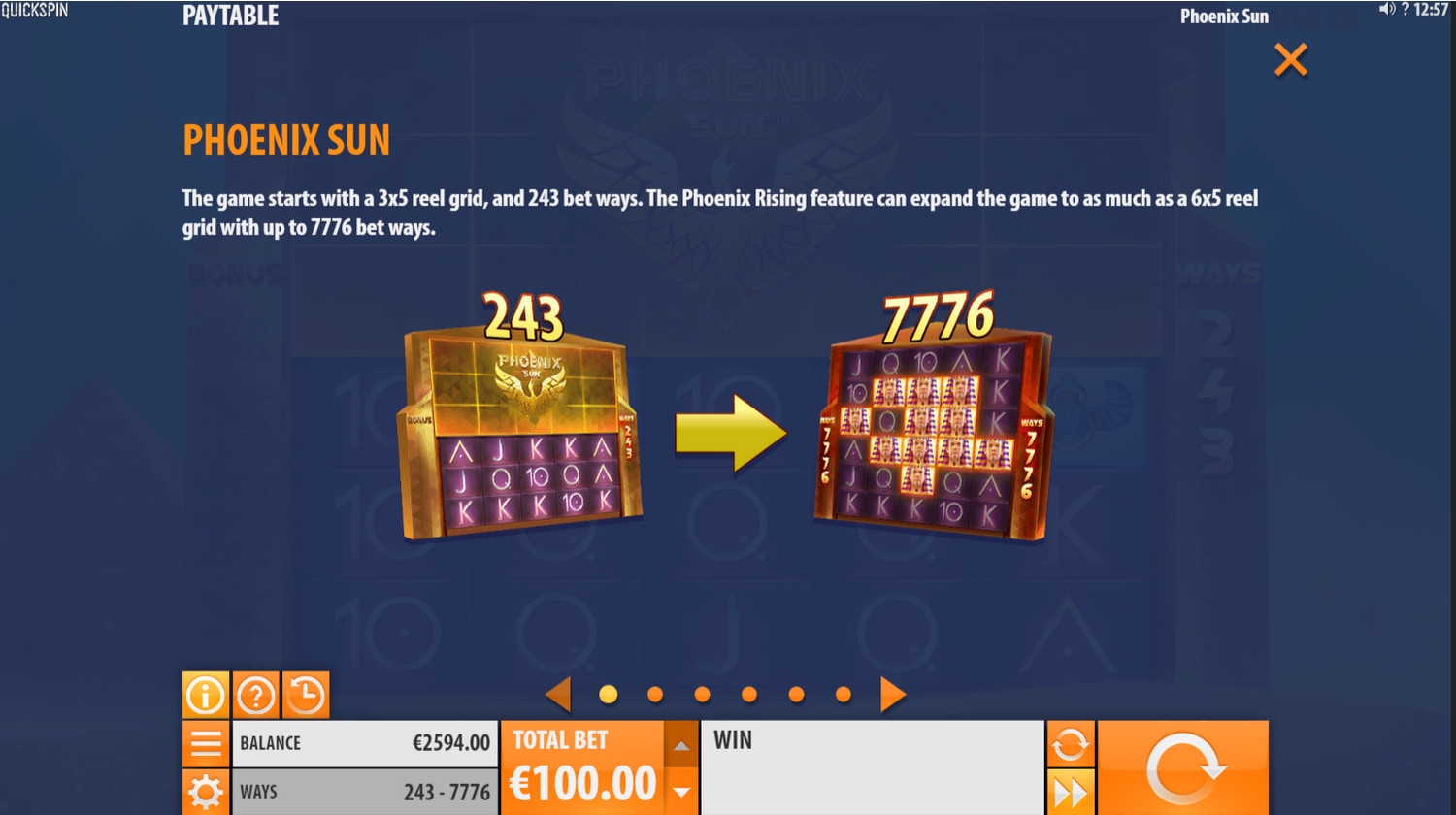 Игровой автомат Phoenix Sun состоит из пяти барабанов. Изначально в каждой колонке появляются по три картинки, но в некоторых спинах количество видимых символов в столбцах может расширяться до шести.
