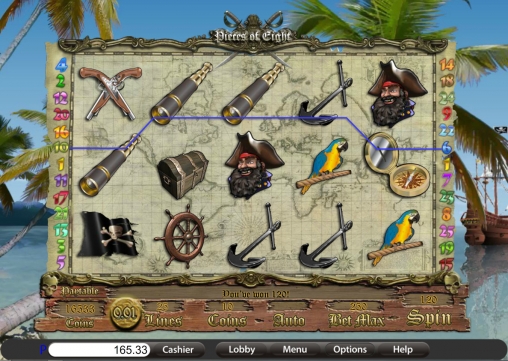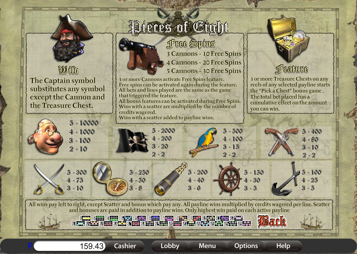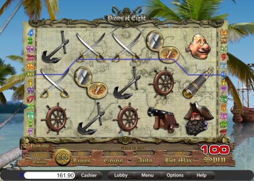 Pieces of Eight представляет собой пятибарабанный видео-слот с двадцатью пятью линиями выплат и тремя рядами картинок на экране. Играть на игровом автомате пользователи могут по любому количеству активных линий, поставив на каждую из них до десяти монет номиналом один, пять или десять центов. Таким образом, на раунд принимается не более двадцати пяти евро.