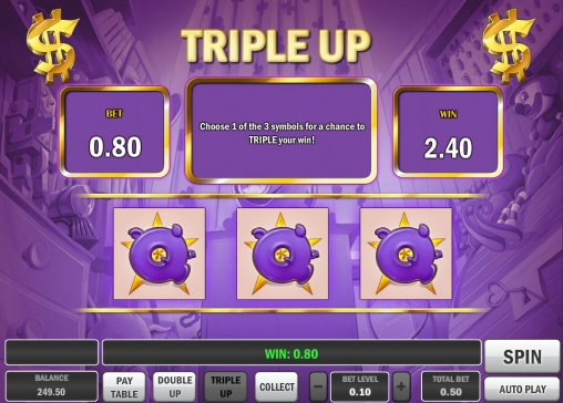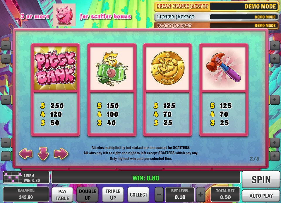 Очень простая игра. Именно про такие я говорю - то что надо! Но это все только внешне. В игре приличное количество индивидуальных настроек, что приятно радует. Максимальная ставка 50 долларов. Минимальная - цент. Самое главное что меня радует в такого рода автоматах - они не тормозят и погружают в и гру с "головой". В игре есть бонусная игра с разбиванием копилок и целых три накапливаемых джекпота, розыгрыш которых производится среди всех участников сети. Джекпота я так и не дождался, а вот бонусные свинки-копилки собирал часто. Игра по мне. Она мне напоминает пятибарабанный слот с семерками. Для тех кто в курсе - поймет. Советую попробовать свои силы, думаю вам понравится.