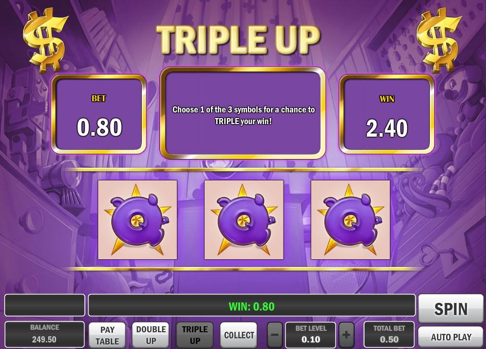 По завершению раунда вы решаете, забрать деньги или поставить их в игре по шансам. Она представлена в двух разновидностях одного типа. В первом варианте вы увидите четыре копилки на дополнительном экране, а во втором случае их будет три. Вам нужно выбрать одну из них. Из четырех копилок две выигрышных. Если вам попадется такая, выплата удвоится. Из трех копилок призовая лишь одна, но она увеличивает выигрыш в три раза. Можно действовать несколько раз подряд, но при первой же неудаче все кредиты уходят в казино.