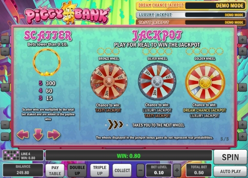 В Piggy Bank есть три прогрессивных джекпота. Они накапливаются путем автоматических отчислений небольшой части ставок, которые делают пользователи, и разыгрываются во всех слотах сети. Называются