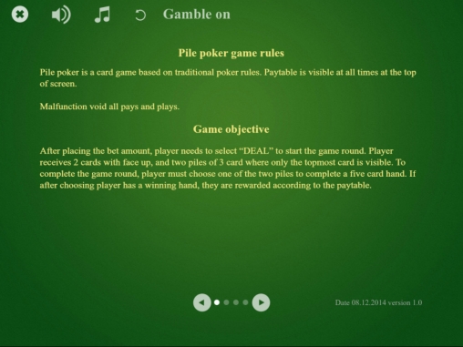 В справочном разделе утверждается, что, если играть в «Пайл-покер», следуя оптимальной стратегии, можно добиться теоретического возврата 98,74%. Это очень высокий показатель для разновидностей покера.