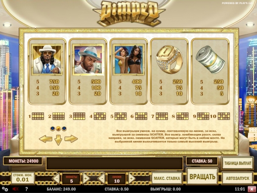 Компания Play’N GO выпустила эффектный онлайн видео-слот, который позволит каждому игроку почувствовать себя мега-крутым парнем, ведущим образ жизни самых известных рэп-музыкантов. Белая шуба, золотой перстень с бриллиантами, полные карманы наличных денег, стройные девушки в бикини – все это ждет вас в модели под названием Pimped. На самом деле, даже если вас совершенно не привлекает подобная тематика, данный бесплатный игровой автомат достоин вашего внимания. Чем он хорош, вы узнаете из обзора от Casinoz.