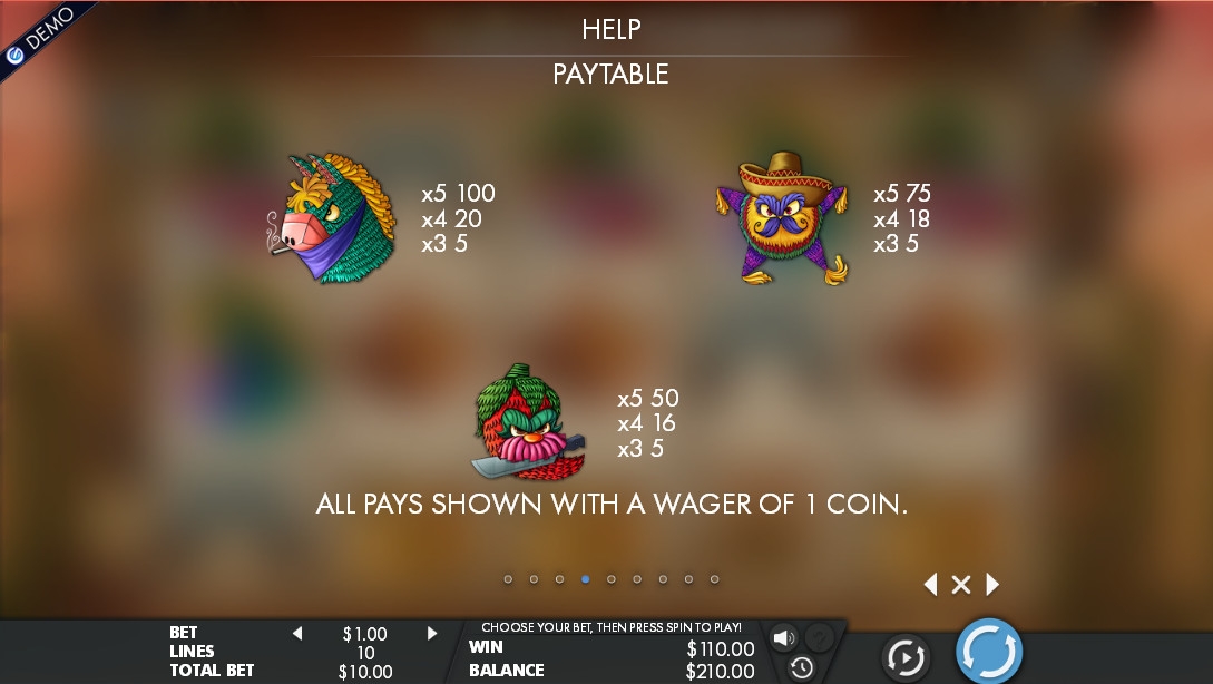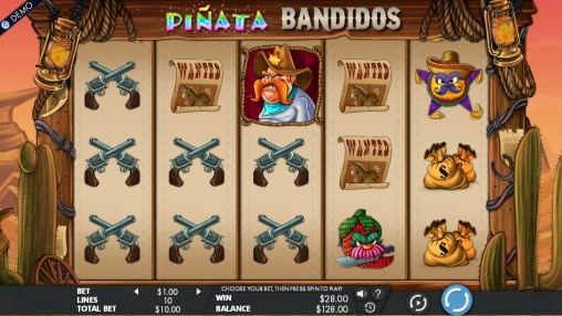 Видео-слот «Бандиты из пиньяты» имеет пять барабанов, десять постоянно задействованных полос и пятнадцать ячеек для картинок на главном экране.