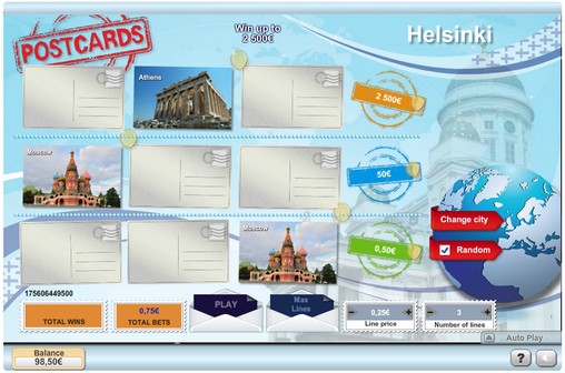 Цель игры в Postcards заключается в том, чтобы найти на линии символ, соответствующий картинке. Игровой процесс подразумевает несколько этапов. Сначала вы должны выбрать на глобусе направление, кликнув по одному из флагов стран (можно оставить случайный выбор). Далее нужно указать количество активных линий и ставку по линии.