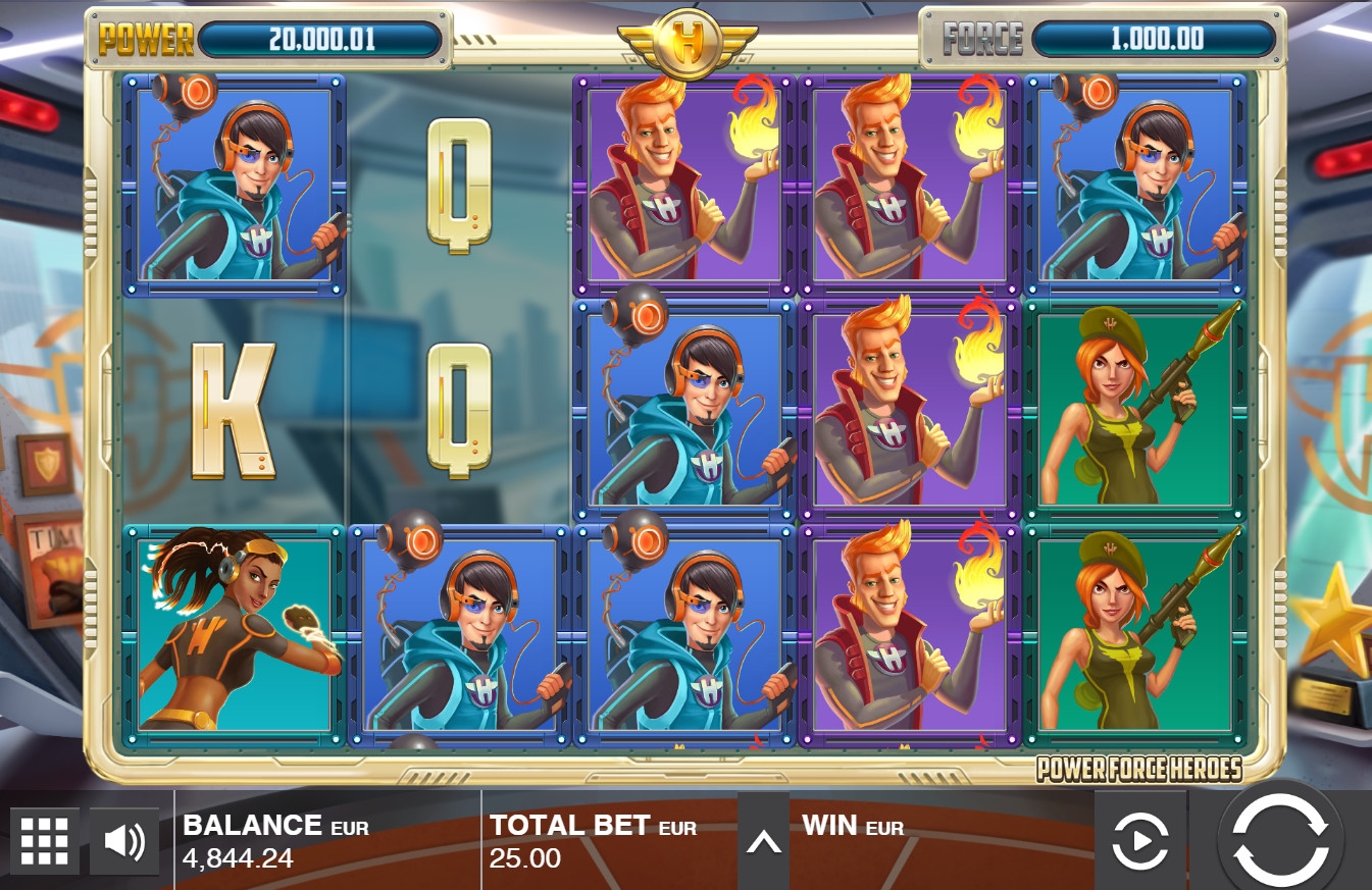 На барабанах видео-слота Power Force Heroes изображены пятеро супергероев: мощный Strong, укротивший огонь Fire, гениальный компьютерщик Gadget, специалист по оружию Commando и невероятно быстрая Speed. Также на экране появляются четыре карточных номинала. Картинки могут выпадать в колонках длинными вертикальными цепочками.
