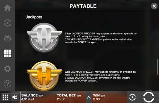 В автомате разыгрываются накопительные джекпоты Power и Force. Бороться за них можно лишь при игре на деньги. Чтобы стать обладателем одного из них, нужно получить где-нибудь на экране три картинки Gold Jackpot Trigger или Silver Jackpot Trigger.