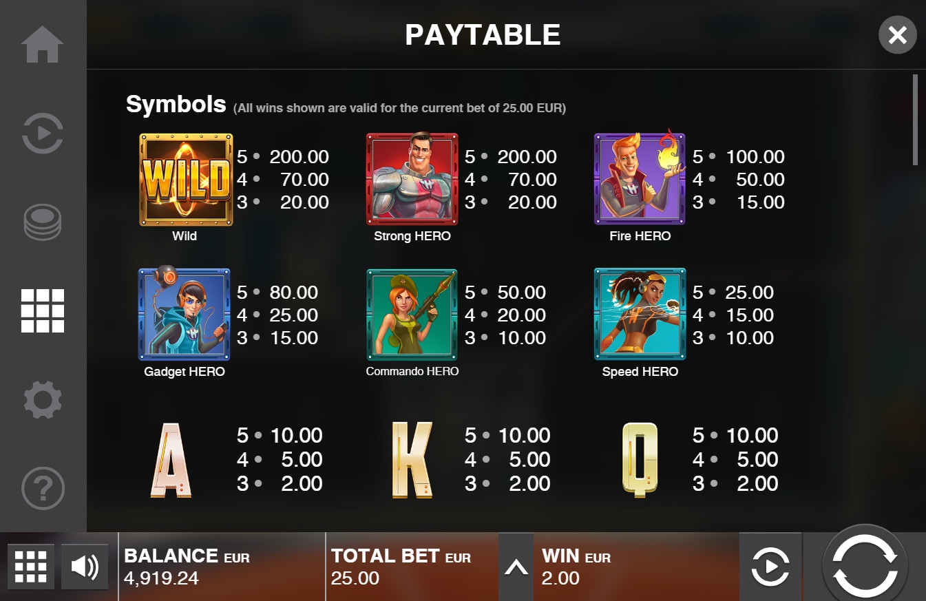 Для расчета выигрыша ставка по линии умножается на коэффициент от х2 до х200, выделенный для каждой из потенциально возможных комбинаций. На удвоение играть в Power Force Heroes нельзя, поэтому деньги автоматически выводятся на основной счет.