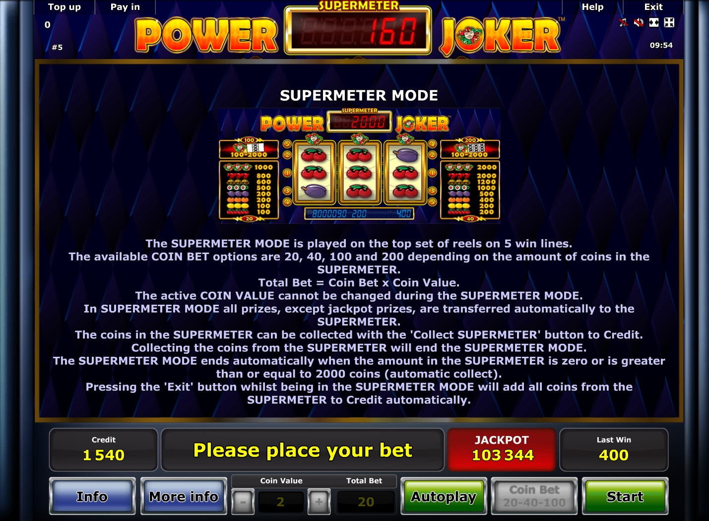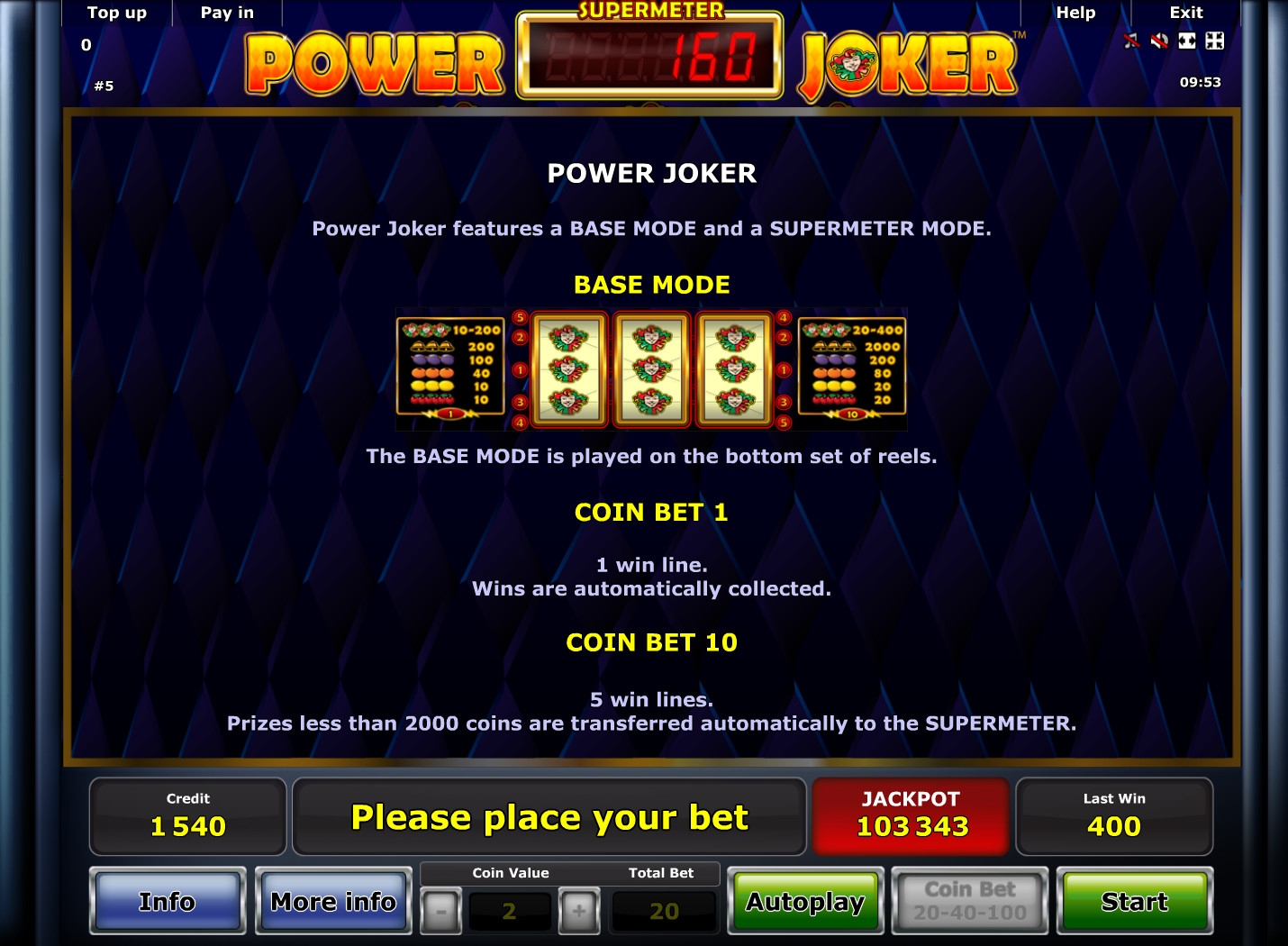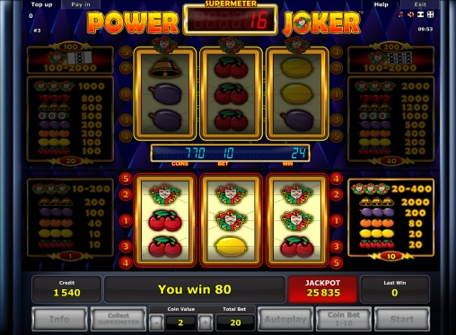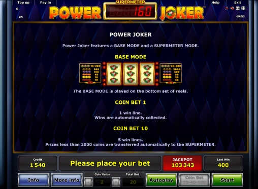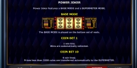 Power Joker представляет собой трехбарабанный игровой автомат с двумя отдельными экранами. На первом игра ведется в режиме Base («базовый»), а на втором активируется Supermeter Mode.