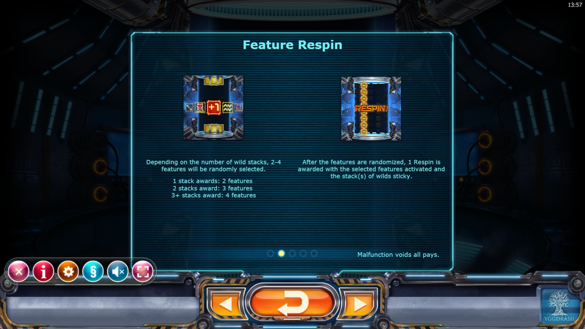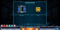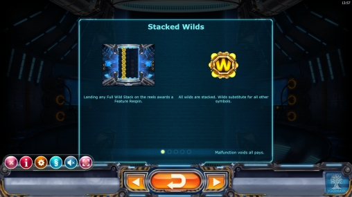 - Wild (знак с буквой W) является джокером, идущий стеками по восемь элементов. Он не оплачивается сам, но заменяет в комбинациях другие элементы. Если он заполняет целиком хотя бы одну колонку, запускается бесплатный респин.