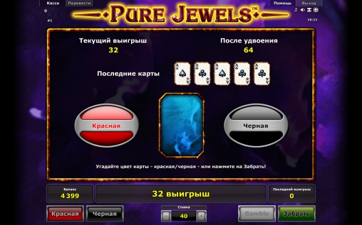 Далее игрок решает, что делать с деньгами. Вариантов два: перевести их на счет или поставить на кон в раунде на удвоение. Во втором случае появляется дополнительный экран с закрытой картой. Ваша задача – угадать ее цвет. Правильный ответ увеличит выплату вдвое. Неправильный означает, что вы лишились ставки. Можно действовать несколько раз подряд, но права на ошибку нет. Есть максимальный лимит, который превышать не разрешается.
