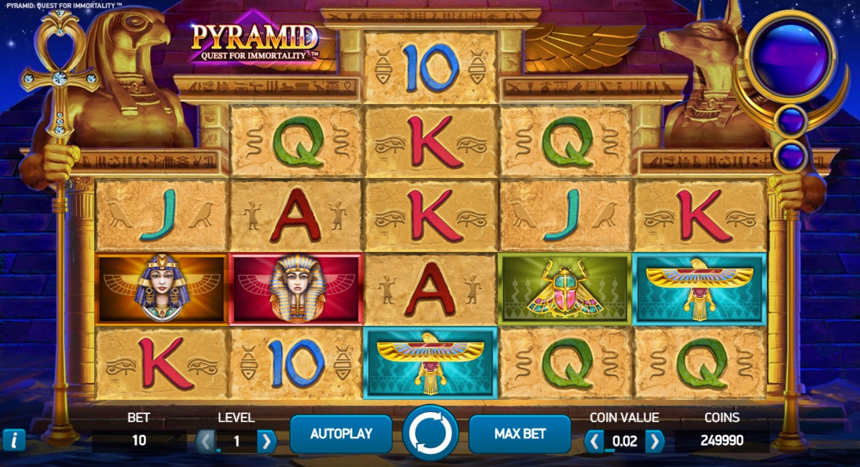 Pyramid: Quest for Immortality имеет пять барабанов. Когда они не вращаются, в первой колонке можно увидеть по три символа, во второй и четвертой представлены по четыре элемента, а в третьей видны пять картинок. Таким образом, на экране одновременно появляются девятнадцать изображений, расположенных в виде пирамиды.