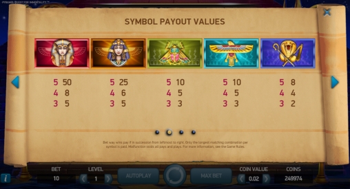 Базовыми картинками, представленными на барабанах видео-слота, являются изображения фараона, Клеопатры, орла, кобры и скарабея, а также номиналы карт от десятки до туза.