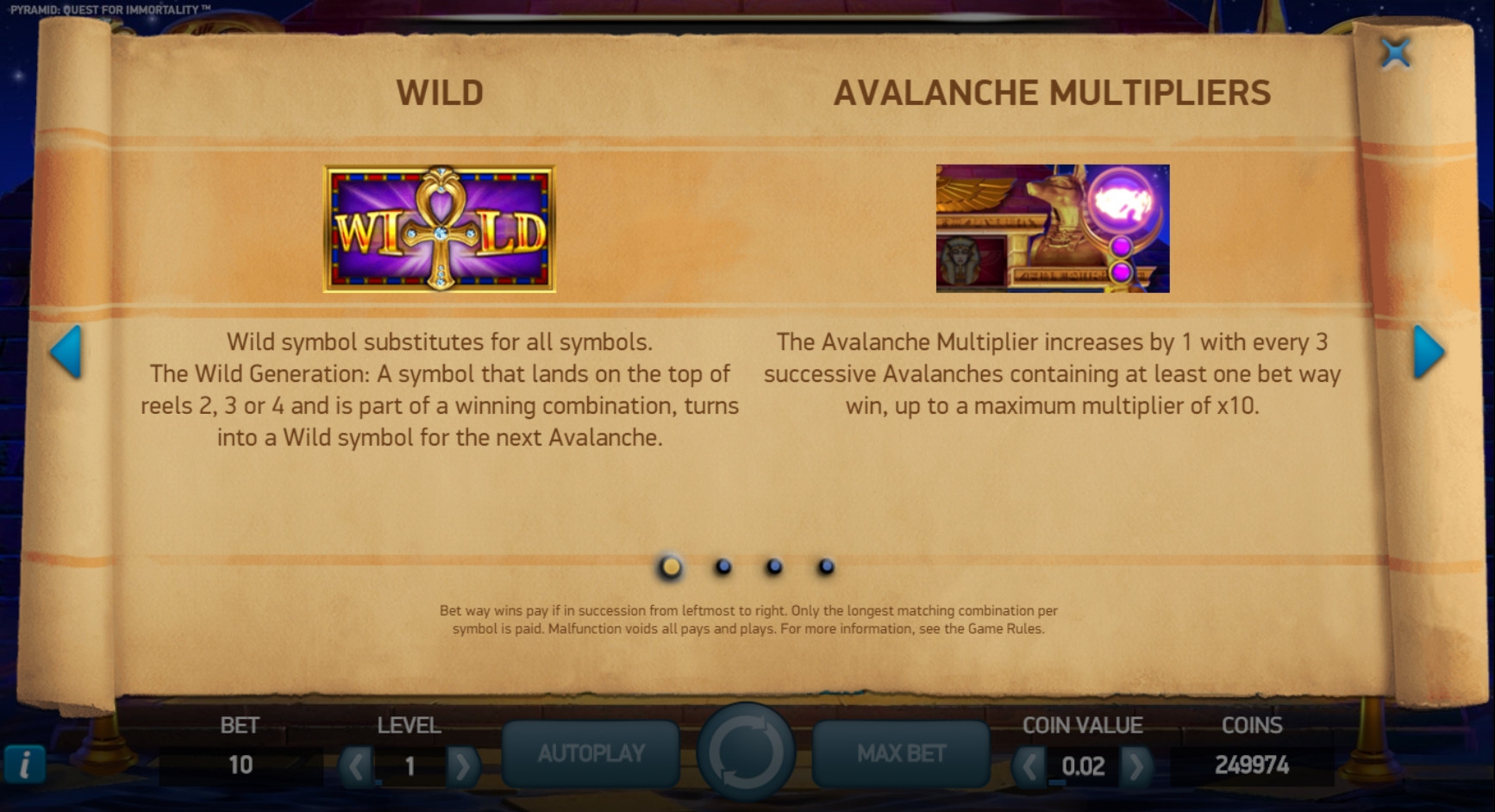 Набор предлагаемых в Pyramid опций состоит из простых картинок, символов с особыми возможностями, функций Avalanche и Wild Generation, бесплатных респинов, дополнительных множителе и так далее. Они рассматриваются чуть ниже.