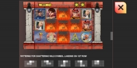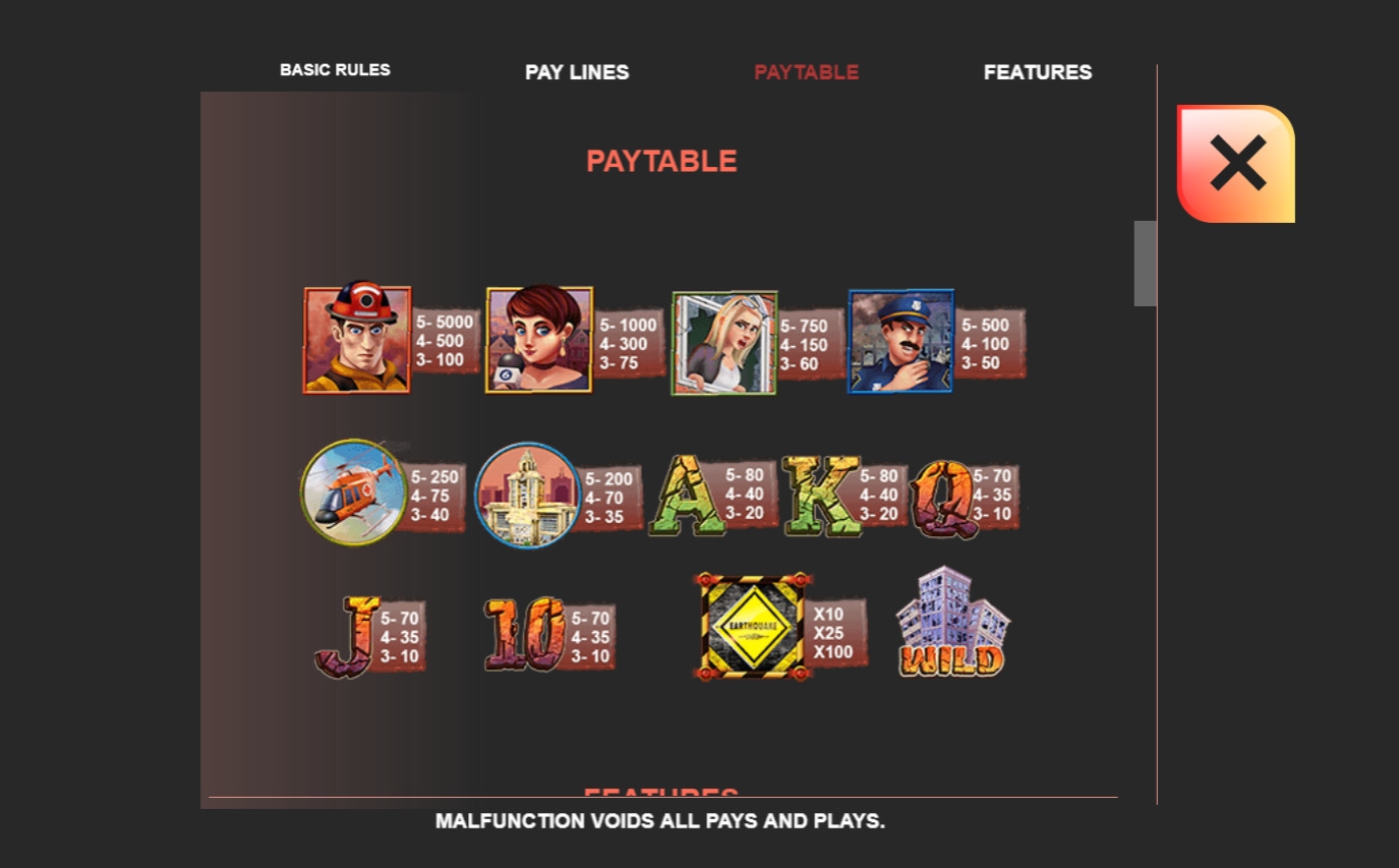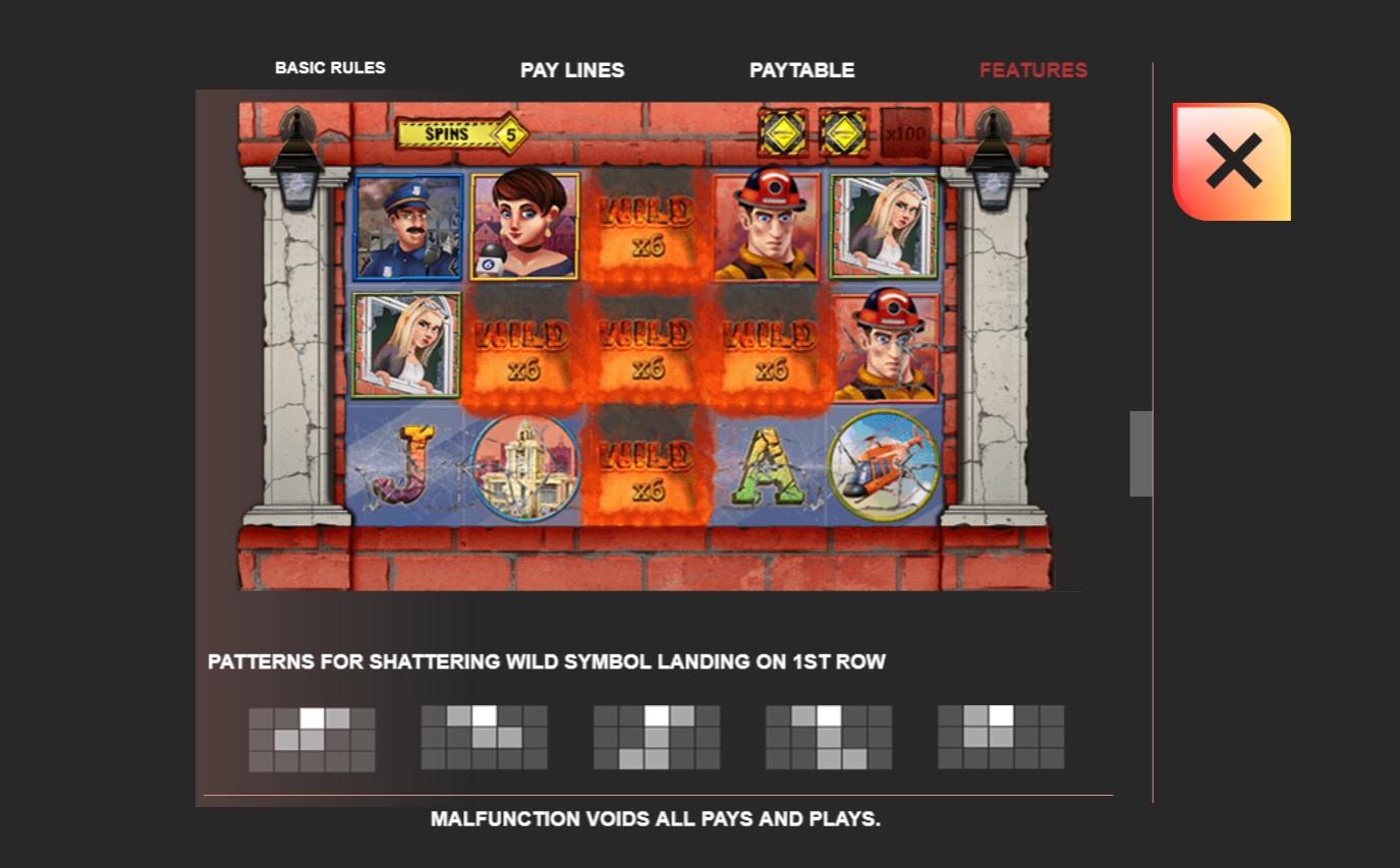 Испуганная девушка в разбитом окне, репортер с микрофоном, брутальный пожарник и усатый полицейский – таковы персонажи игры. Кроме них, на барабанах изображены вертолет медицинской службы, полуразрушенное здание и потрескавшиеся карточные номиналы.