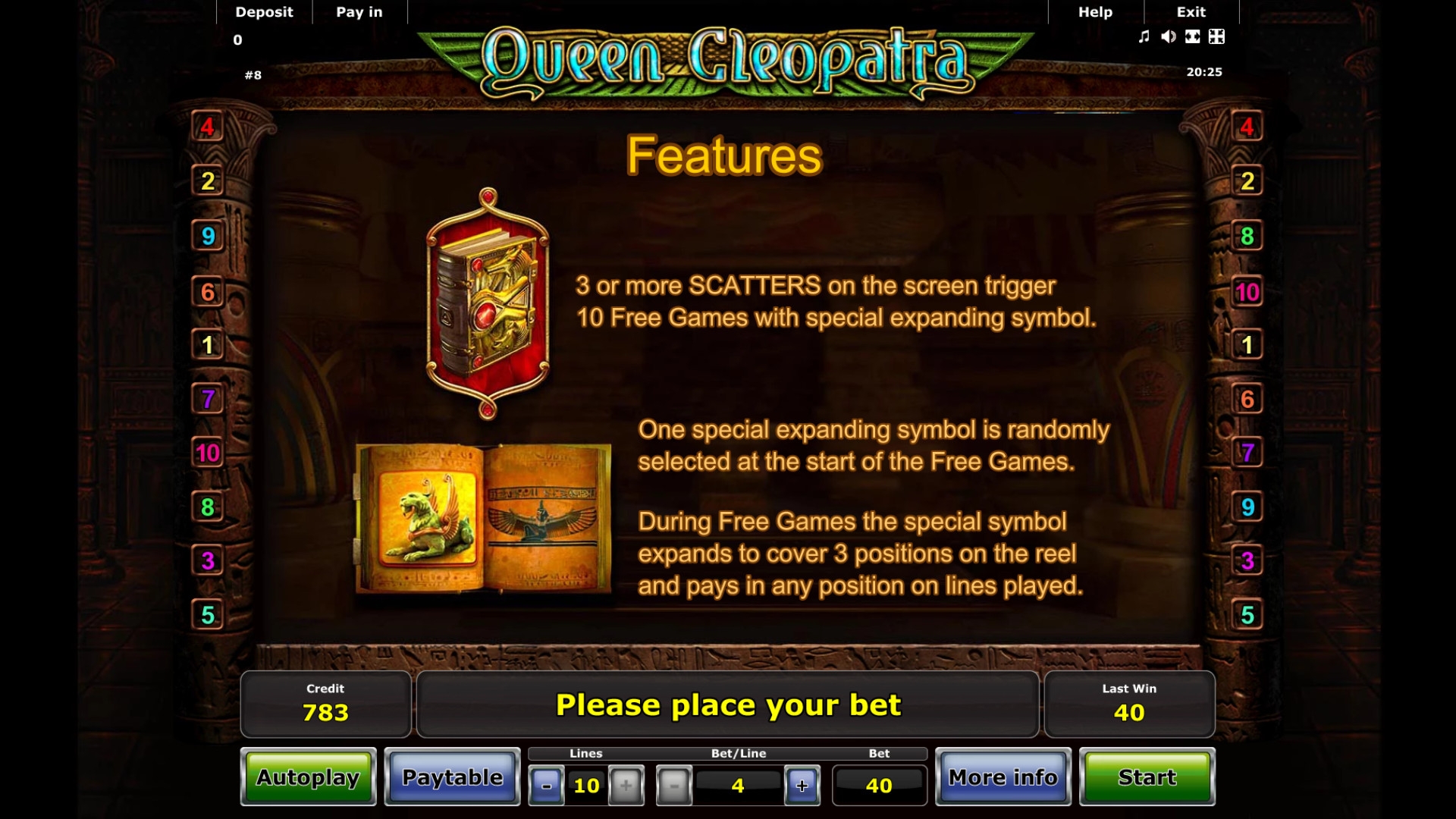 Открывайте бесплатную версию игрового автомата или запускайте Queen Cleopatra на деньги в онлайн-казино StarGames. Вы также найдете модель в других заведениях на лицензионном «Новоматике».