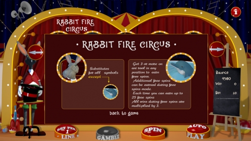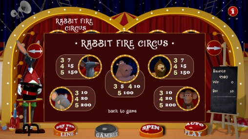 На барабанах видео-слота Rabbit Fire Circus появляются животные, выступающие с уникальными номерами на арене цирка. Какие именно трюки они исполняют, вы увидите, когда будет запускаться анимация при образовании комбинаций.