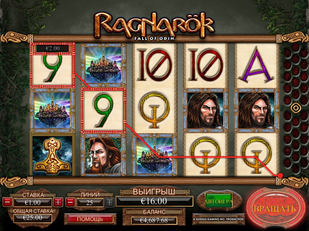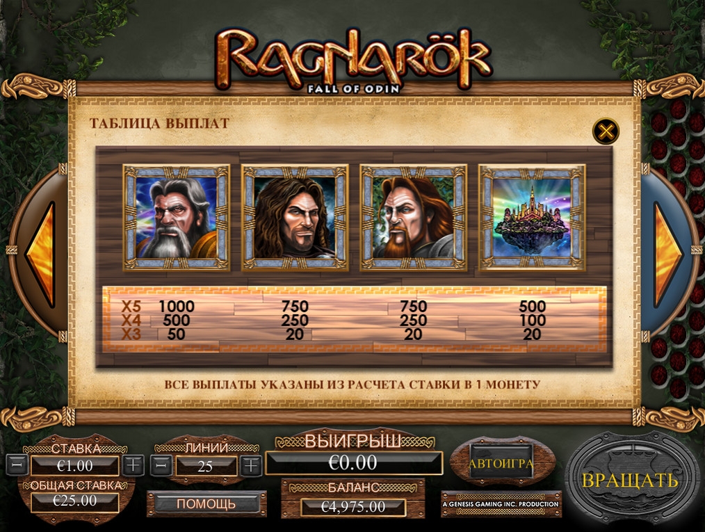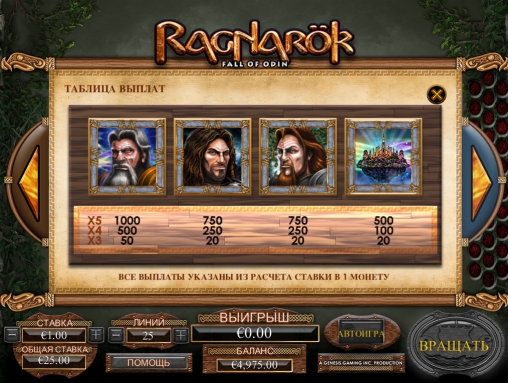 На барабанах игрового автомата Ragnarok: Fall of Odin изображены персонажи германо-скандинавской мифологии, нарисованные в виде рун обозначения номиналов игральных карт и другие картинки.