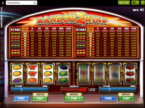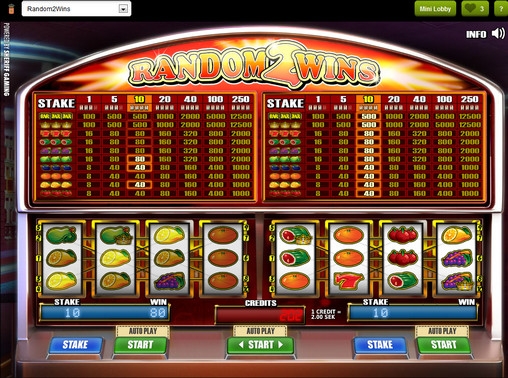 Random2Wins – спаренный игровой автомат, состоящий из двух независимых друг от друга видео-слотов. На обоих экранах по четыре барабана и три ряда символов. Играть на каждом из них можно только по пяти или десяти активным линиями.