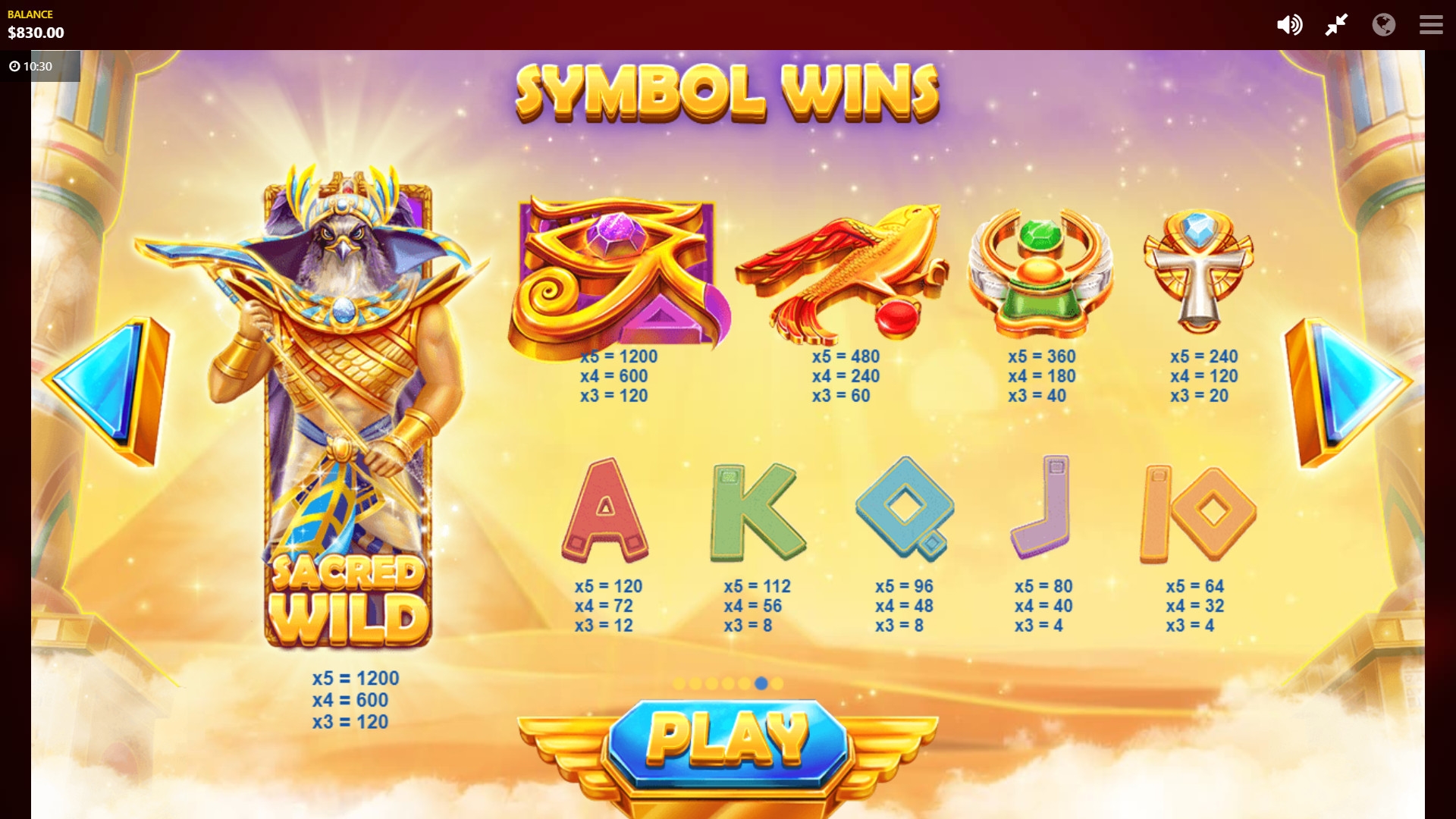 - Sacred Wild – Появившись в любом столбце, бог Ра начинает один или несколько повторных респинов. При этом сам он не покидает своей колонки.