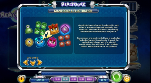 - Giantoonz & Fluctuation – Выигрыши по комбинациям с участием таких кластеров удваиваются. Также помечается один из одноглазых персонажей. Далее он будет оставлять за собой джокеры, если примет участие в формировании цепочек.