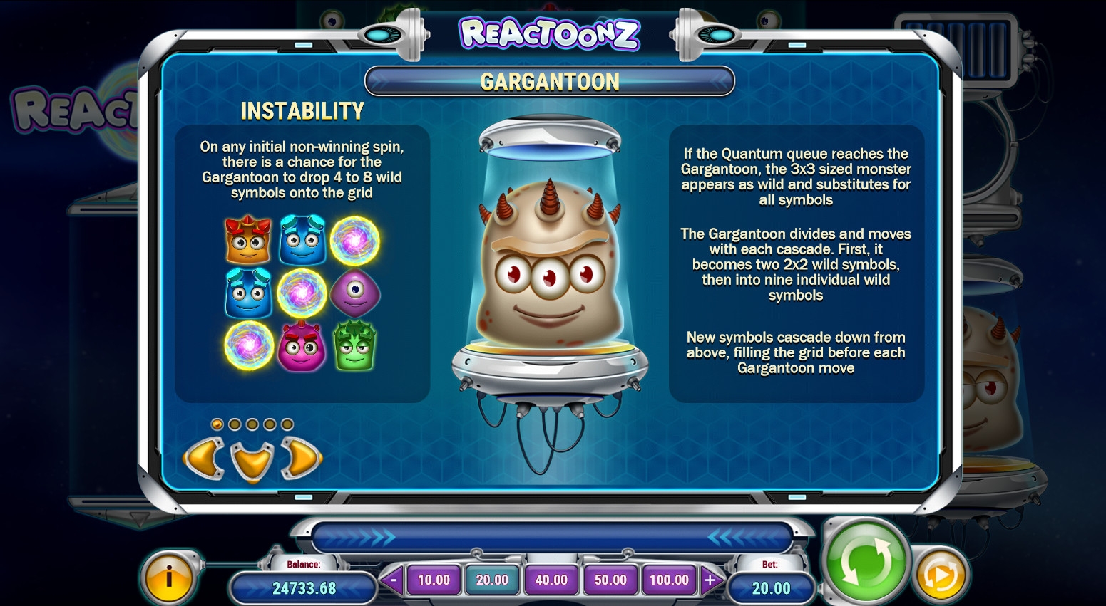 Аппарат богат всевозможными призовыми функциями. Начнем с того, что рядом с барабанами постоянно находится Gargantoon. В любом проигрышном спине он может активировать Instability. Вкратце о ее правилах: