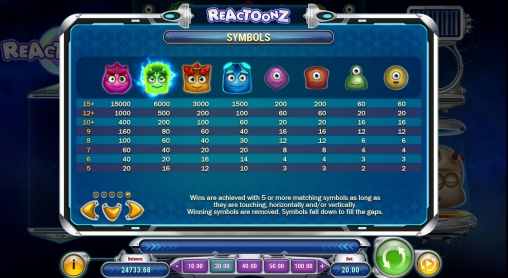 В Reactoonz доступны базовые символы, джокеры, бонусные иконки и несколько призовых опций.