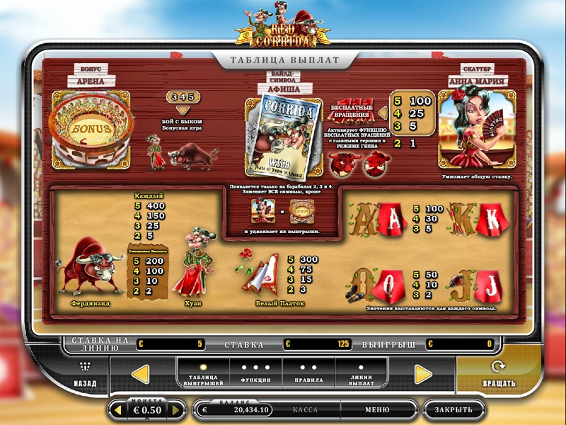 Red Corrida - это пяти-барабанный видео-слот с 25-ю линиями выплат, производства Oryx Gaming. В игре используется "wild"-символ, символ скаттера, есть множитель, свободные вращения и бонусные раунды.