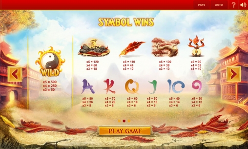- Wild (знак инь-ян) оплачивается сам по себе и заменяет другие простые картинки, выпадая в соответствующих позициях. Вместо особых элементов он не используется.