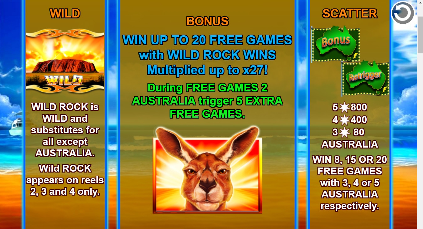- Scatter (очертания Австралии на карте) оплачивается независимо от расположения. Выигрыши считаются по общей ставке. От трех скаттеров запускают фри-спины.