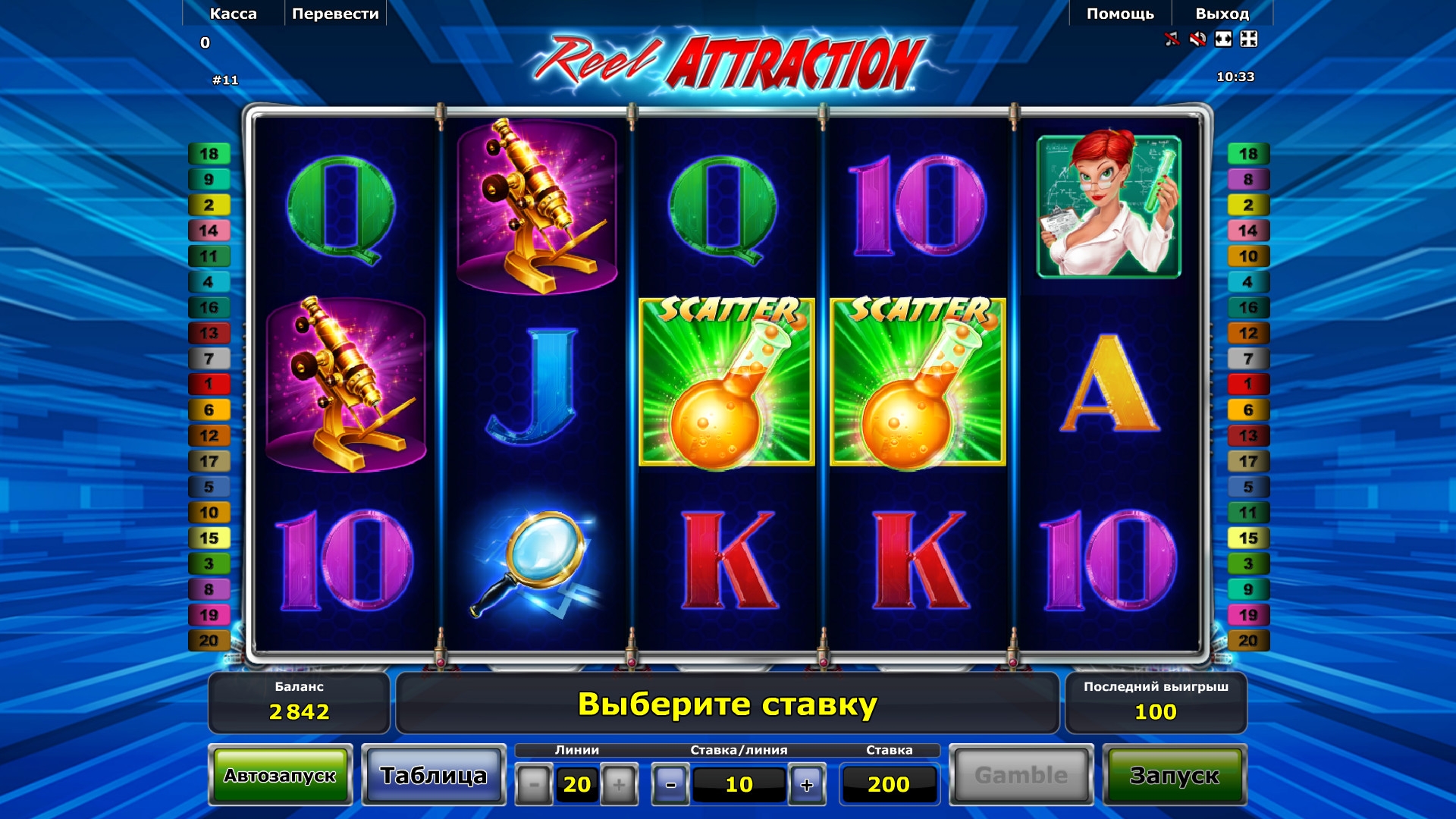На экране видео-слота «Притяжение барабанов» появляются картинки с рыжеволосой ассистенткой профессора, микроскопом, моделью атома, лупой и разноцветными номиналами игральных карт от десятки до туза.