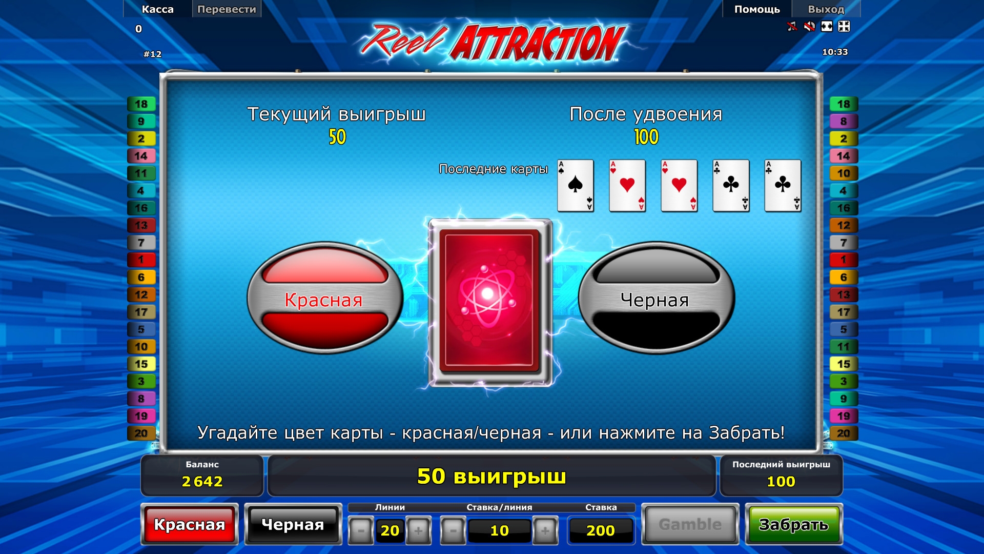 По завершению спина можно запустить игру по равным шансам. На отдельном экране появится закрытая карта, и вы должны будете угадать ее цвет. Правильный ответ удваивает выплату, а неправильный означает проигрыш ставки. Разрешается действовать несколько раз кряду, но есть лимит.