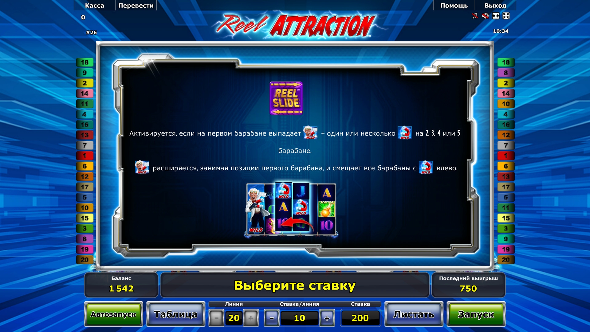 - Wild (профессор) выпадает на первом барабане и может растягиваться на всю колонку. Он способен заменять обычные картинки в комбинациях и участвует в функции Reel Slide, о которой рассказывается ниже.