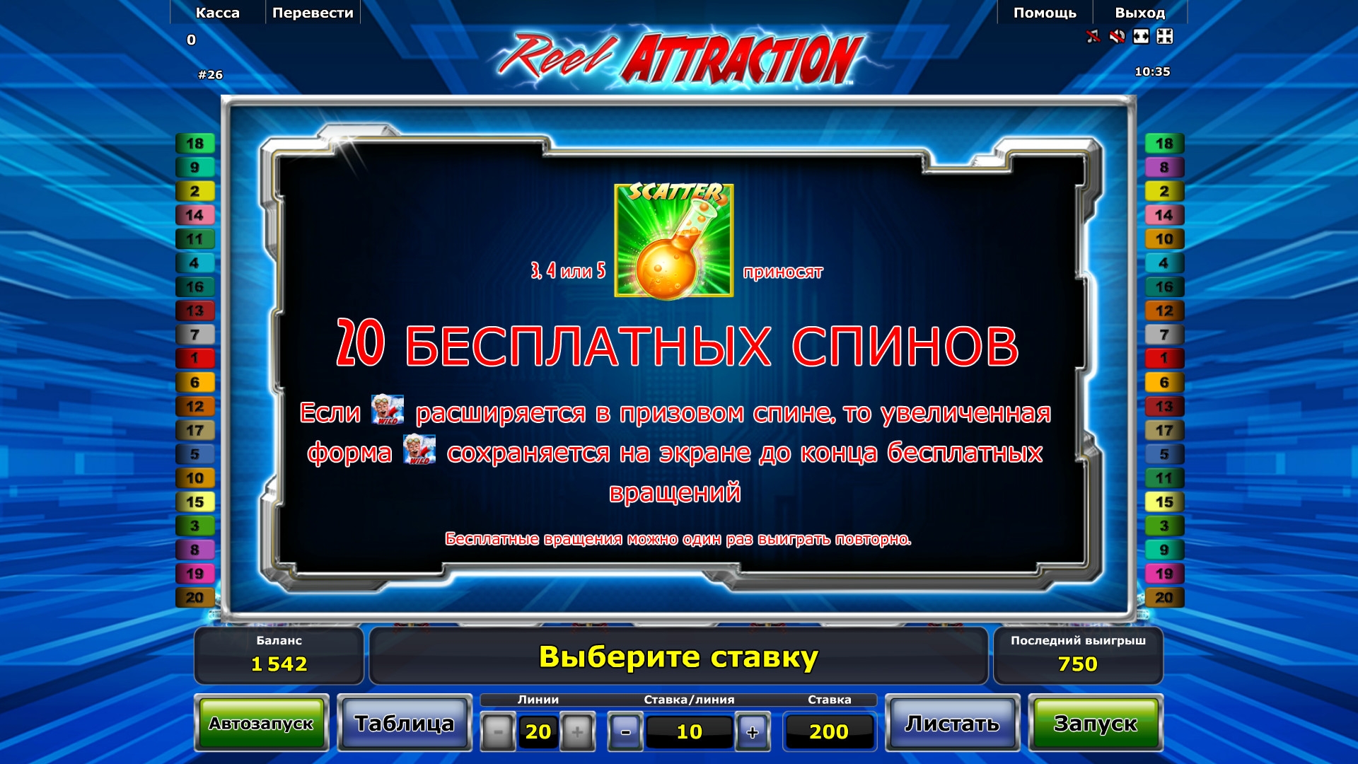 автоматом с пятью барабанами, пятнадцатью картинками на главном экране и двадцатью постоянно задействованными линиями для образования на них комбинаций.