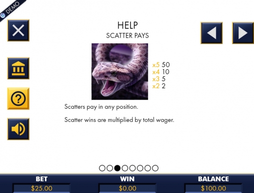 - Scatter (анаконда) оплачивается, выпадая в любых позициях, а выигрыши считаются по общей сумме на кону. От трех скаттеров начинают призовой раунд.