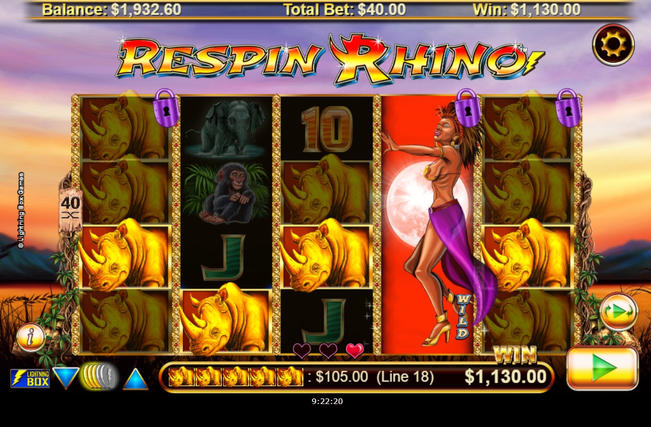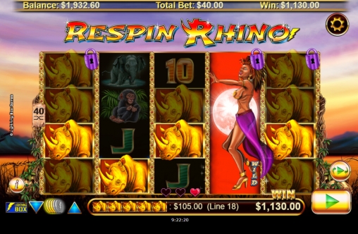 Видео-слот Respin Rhino имеет пять барабанов. Комбинации формируются на сорока постоянно активных полосах. Иконки выстраиваются на экране в четыре ряда.