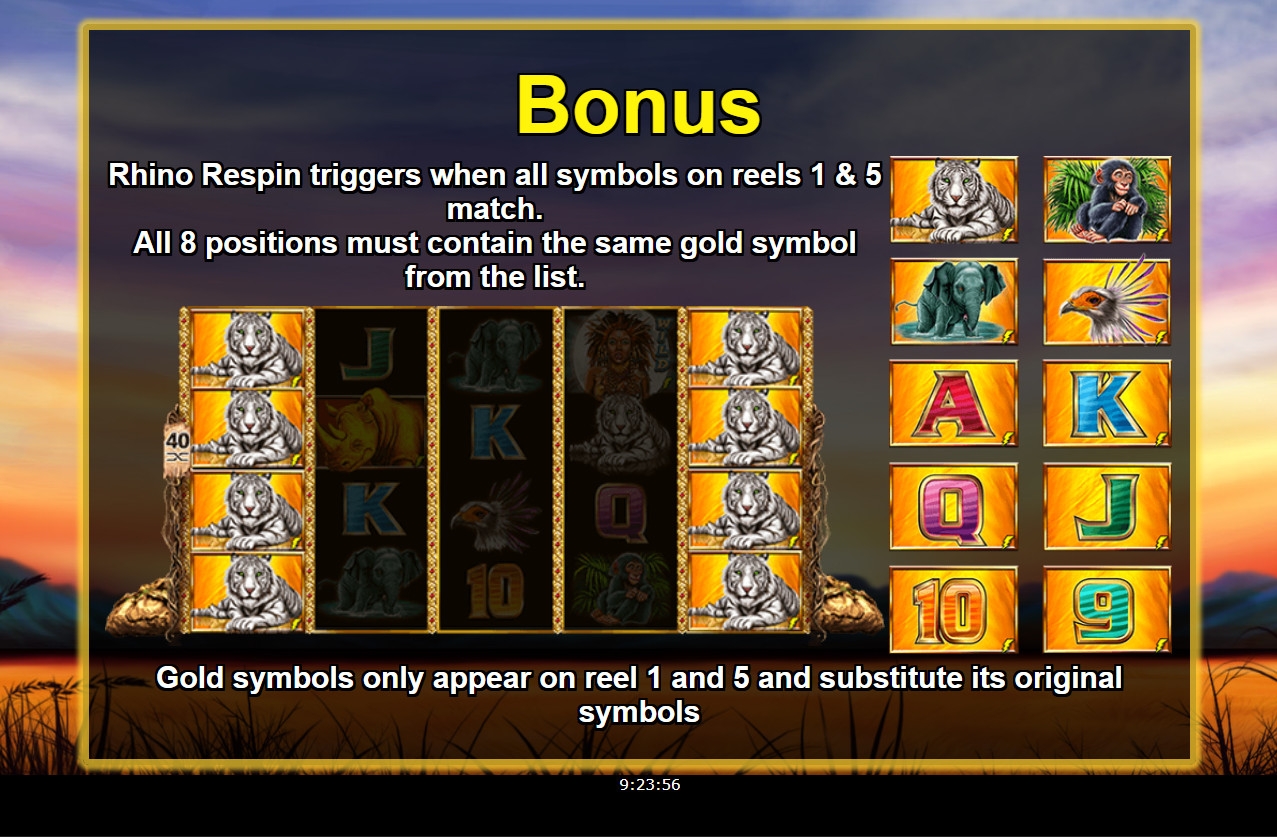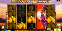 - Respins – Раунд начинается, если первая и пятая колонки заполняются одинаковыми картинками. Эти символы превращаются в золотых носорогов и остаются на месте до конца розыгрышей. Три средних барабана бесплатно вращаются три раза. Ставку прежнего размера делает казино. Одиночные носороги выпадают в большом количестве, составляя комбинации с максимальными коэффициентами. Если появляется джокер, он заполняет столбец, начинает респины заново и остается на экране до конца.