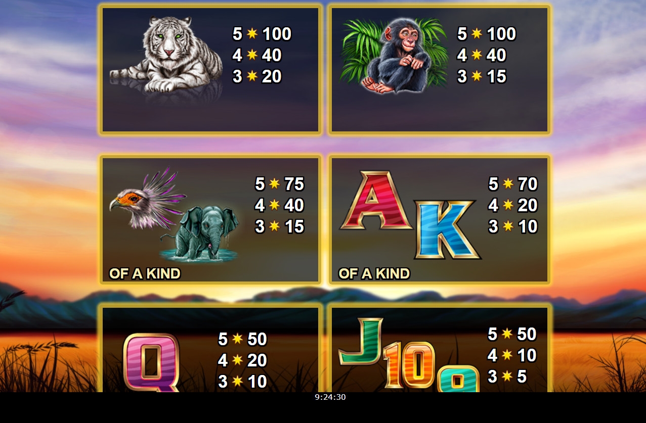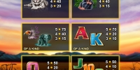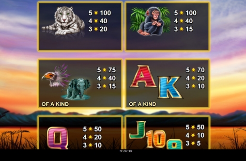 Вы увидите на экране слота тигра, шимпанзе, грифа, слона, а также шесть разноцветных букв и цифр, обозначающих карточные номиналы. Одинаковые символы могут следовать друг за другом в колонках.