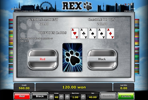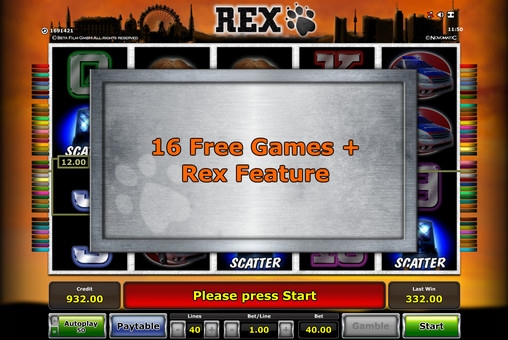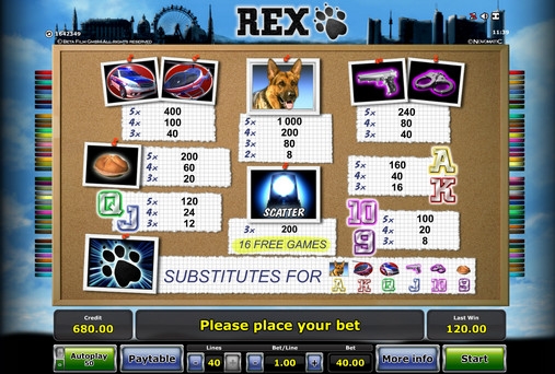 Rex – бесплатный игровой автомат от компании Novomatic, обладающий пятью барабанами, сорока линиями, особыми символами, рискованной игрой по шансам, бесплатными спинами и другими функциями, о которых вы узнаете из обзора от портала Casinoz. Картинки на экране видео-слота располагаются в три ряда.