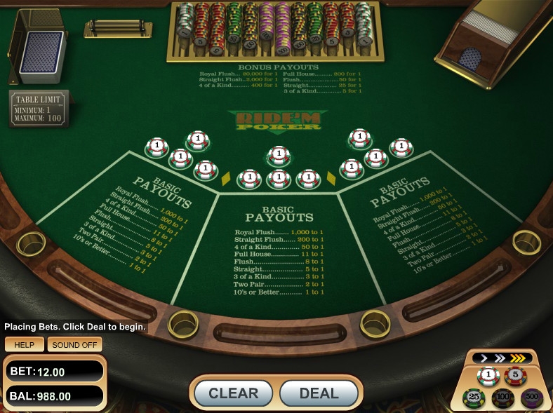 Играть в «Райдем покер» можно на один, два или три бокса. Для игры используются монеты номиналом один, пять, двадцать пять, сто и пятьсот евро (две последних опции в казино, где мы тестировали игру, были недоступны из-за ограниченного максимального лимита). В целом на одну руку можно поставить не более девяноста девяти евро (три по тридцать три). Ставки на отдельных боксах могут быть разного размера.