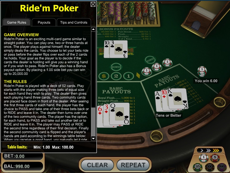 Ridem Poker – бесплатный онлайн-покер, в котором пользователь играет против заведения. При этом решения принимает лишь клиент, а крупье (читай генератор случайных чисел) только сдает карты, определяет наличие комбинаций и производит выплаты.