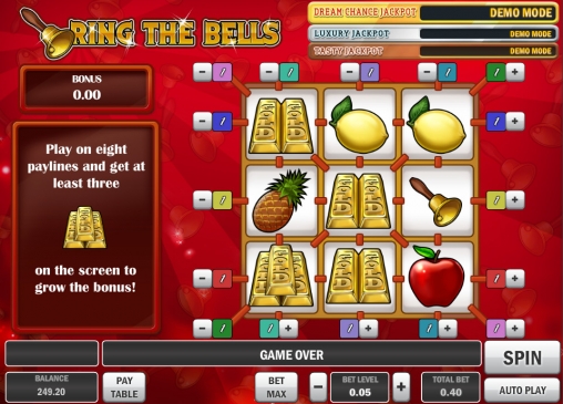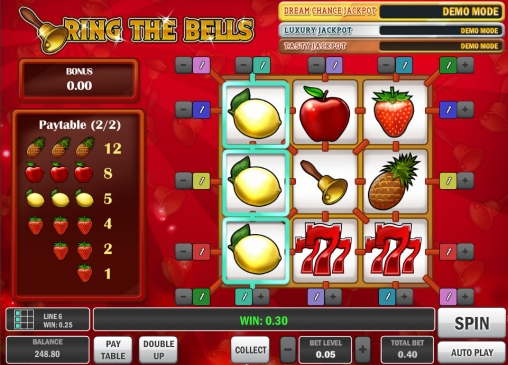 В Ring the Bells девять картинок на основном экране, которые размещаются по схеме 3х3. Барабанов здесь три, а линии, предназначенные для формирования на них выигрышных комбинаций, располагаются горизонтально, вертикально и диагонально. Всего их восемь, но пользователь может задействовать не все полосы.