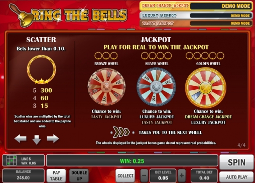 В игре три прогрессивных джекпота: Tasty, Luxury и Dream Chance (от меньшего к большему). Они разыгрываются на бронзовом, серебряном и золотом колесе фортуны соответственно. Барабаны запускаются на отдельном экране. С бронзового и серебряного колеса можно перейти на новый уровень.