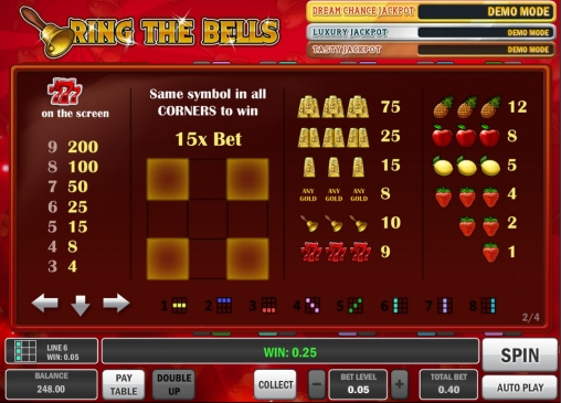 - Призовая выплата в размере пятнадцати общих ставок на спин полагается за четыре одинаковых картинки, оказавшихся одновременно в разных углах экрана.